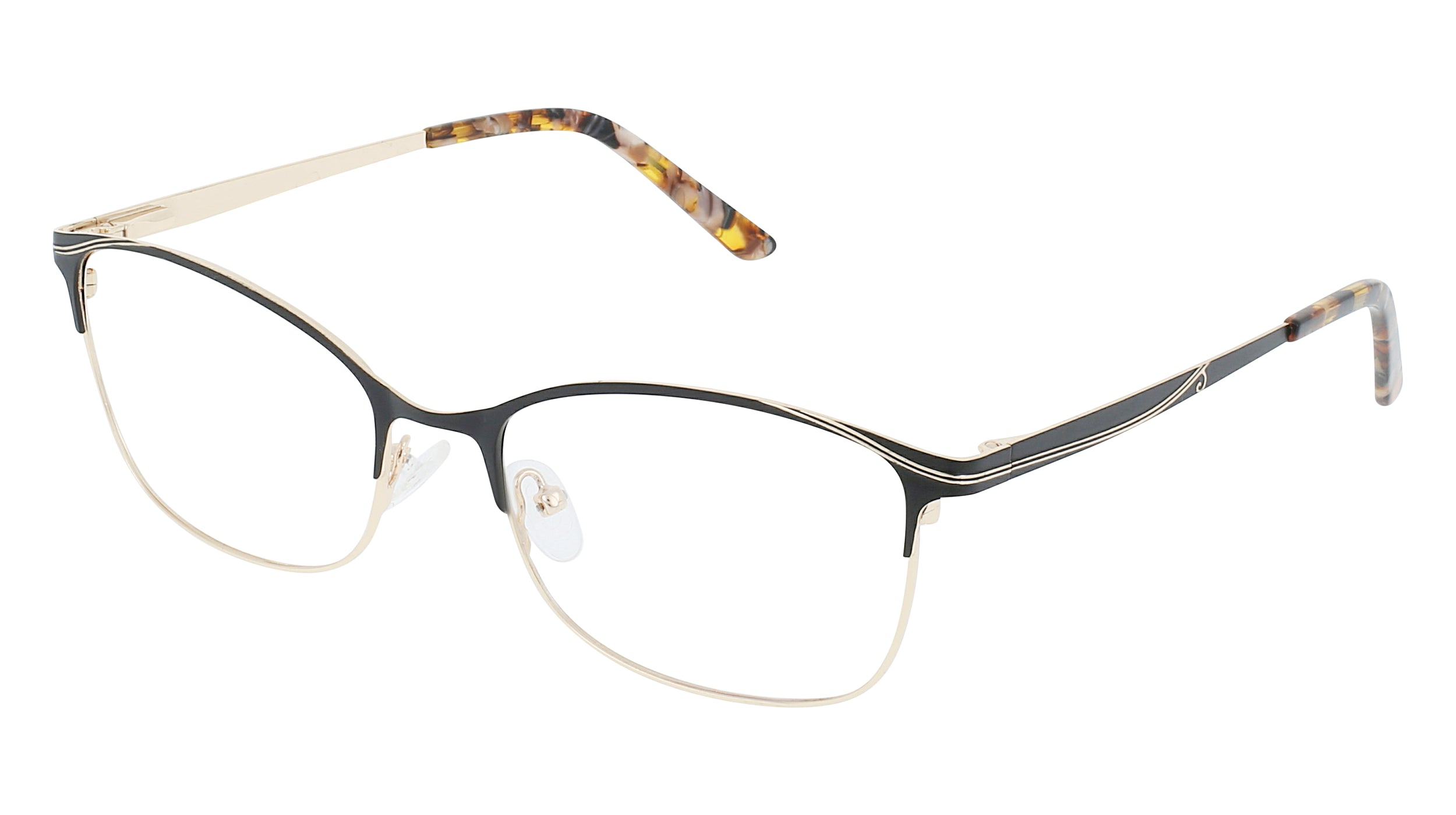 Compelling delivers elegant and sophisticated style in a cat-eye frame crafted from metal. Designed for women, the wide fit with adjustable nose pads offers lightweight comfort. Works with single vision, progressive, transition, and blue light lenses.
